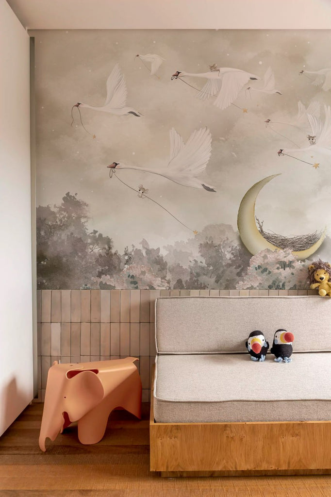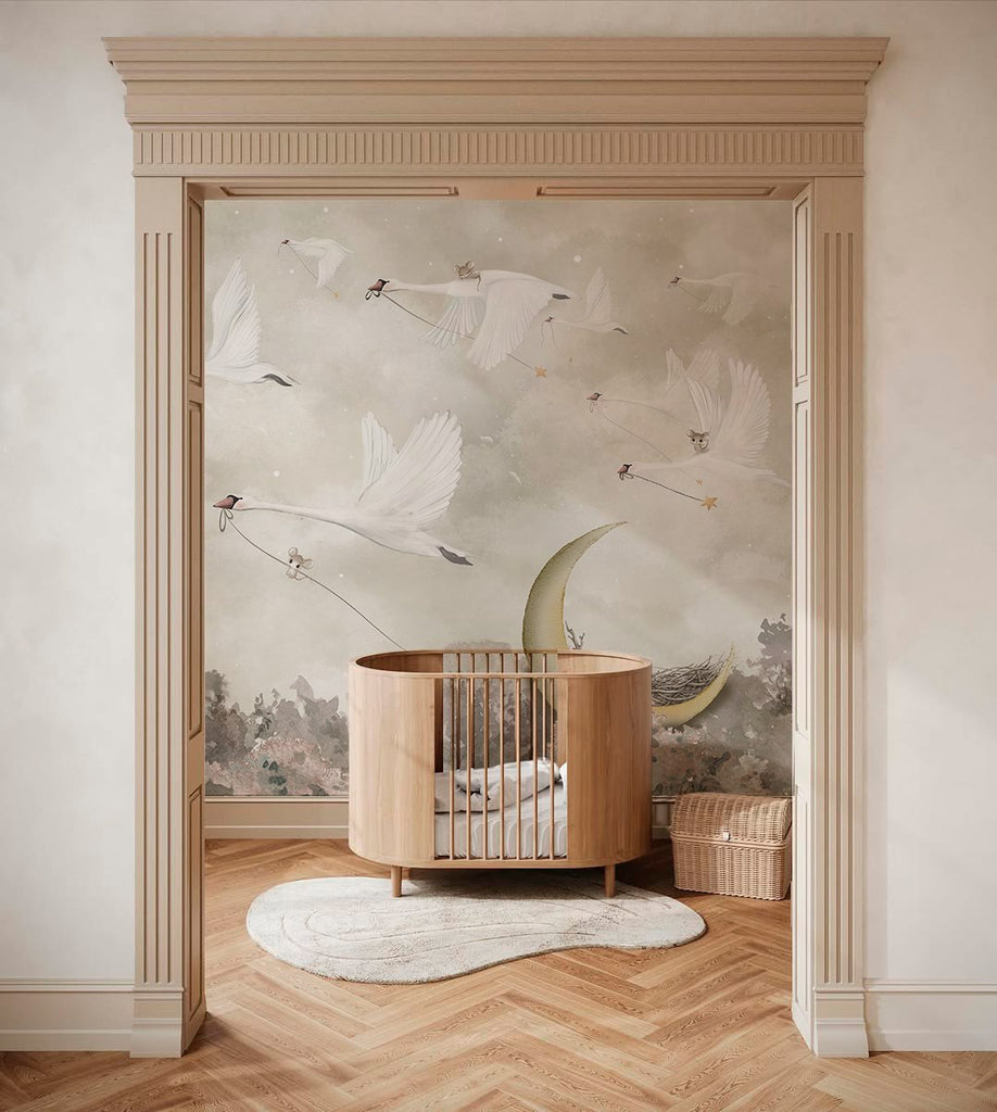 Un papier peint poétique qui met en scène un cygne délicat et enchanteur, parfait pour une décoration murale de chambre bébé ou d'enfant.. Les petits s'imaginent voguer sur les eaux calmes et écouter les contes féériques du cygne magique. Ses tons beiges et tendres apportent chaleur et élégance, créant une ambiance douce et rassurante. Ce papier peint cygne beige est  Idéal pour  un univers apaisant et raffiné, propice aux rêves. Une décoration murale originale qui invite à la tendresse et à l'imaginaire, parfaite pour une chambre d'enfant.